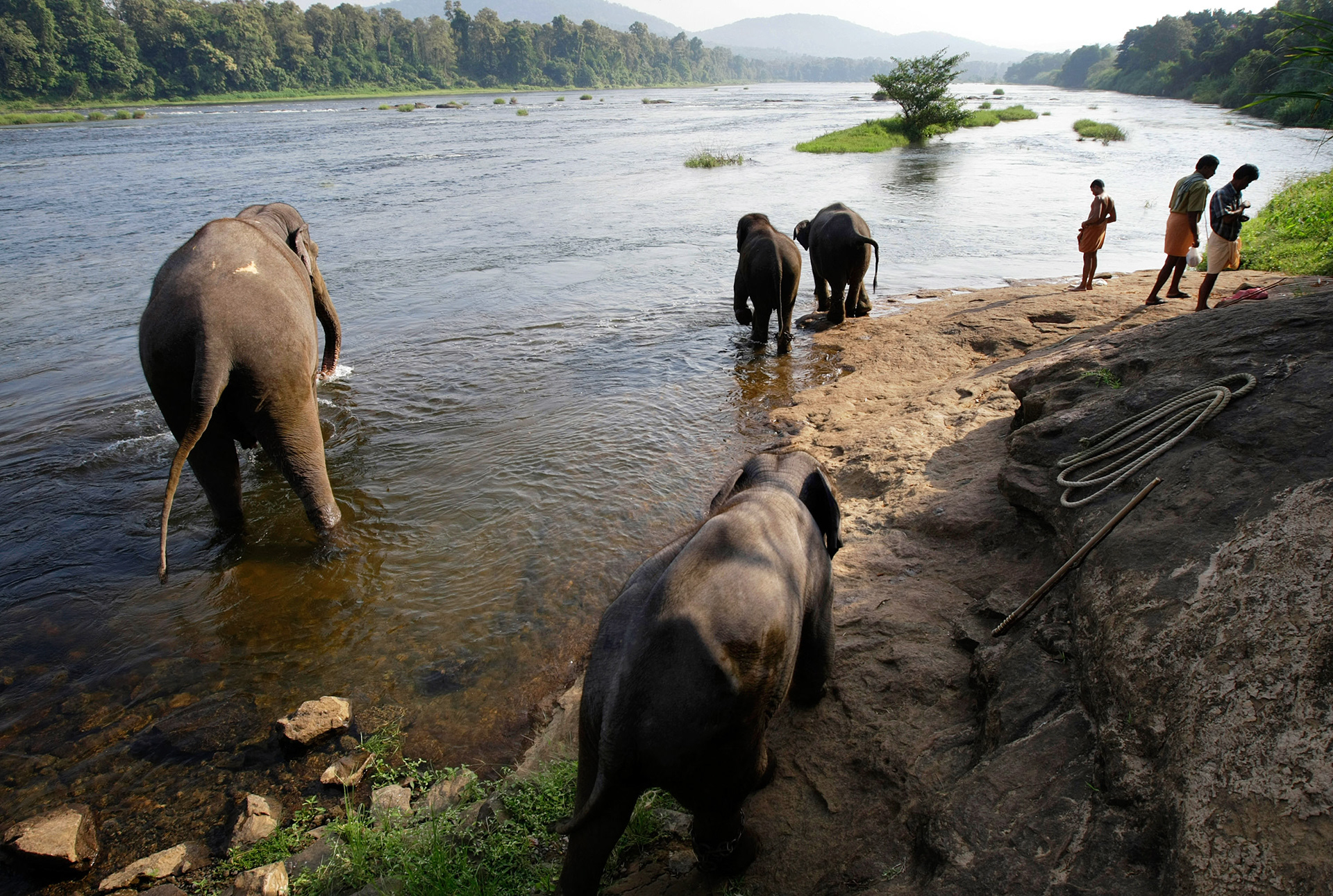 Elephants and their trainers from the Kodanad elephant centre arrive at the Periyar River to bath.